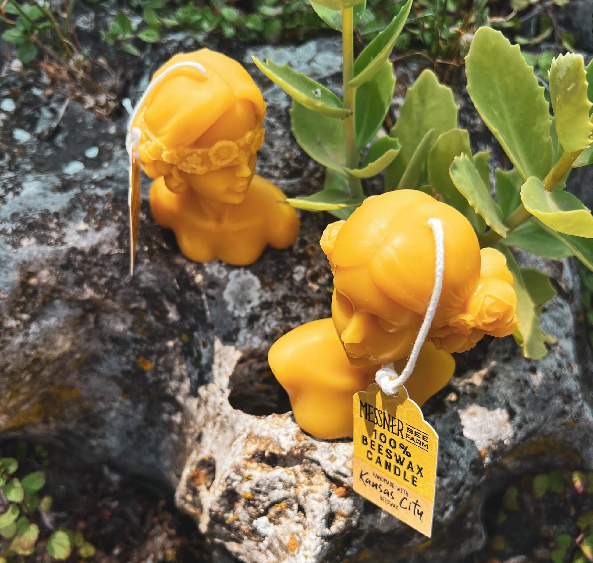 Our 100% Beeswax candles are hand poured and made with local Kansas City beeswax! These candles have no added scent - but they do have their own unique warm honey aroma. This scent may vary slightly based on the honey, pollen, and propolis content in the beeswax.